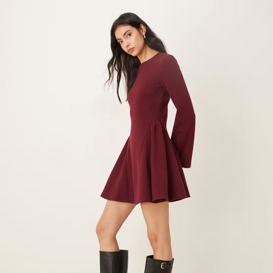 Long Sleeve Godet Mini Dress in Burgundy