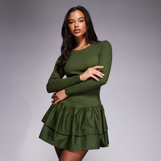 Ribbed Mini Dress with Woven Skirt in Green