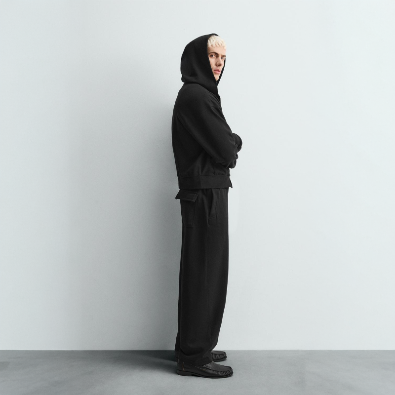 A modern cropped hoodie designed in cotton fabric with a soft looped interior. It features an adjustable hood, long sleeves, and a front zip closure for versatile wear. Functional kangaroo pockets and ribbed trim complete the look.
